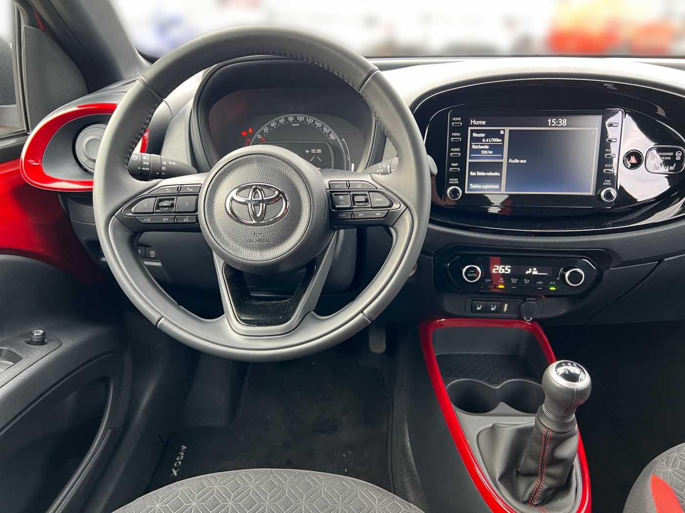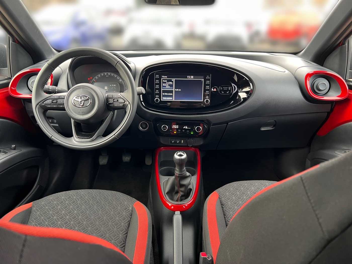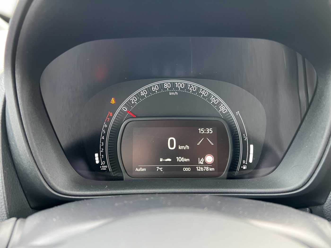 Scheibenwischer mit Regensensor, Klimaautomatik 2-Zonen, Zentralverriegelung / Startanlage Smart-Key, Entry & Drive, Zentralverriegelung, Scheinwerfer LED, Tagfahrlicht LED, Einparkhilfe vorn und hinten, Dach in Kontrastfarbe, Mica-Lackierung, 3. Bremsleuchte, Airbag Fahrer-/Beifahrerseite, Anti-Blockier-System (ABS), Audiobedienung am Lenkrad, DAB-Tuner (Radioempfang digital), Multimedia Display (8,0 Zoll), Freisprechanlage Bluetooth, Bluetooth-Schnittstelle, USB-Schnittstelle, Smartphone-Integration x-connect (Apple CarPlay und Android Auto), Autom. Begleitfunktion der Beleuchtung (Follow me home, FMH), Außenspiegel elektr. verstell- und heizbar, Außenspiegel schwarz lackiert, Nebelscheinwerfer, Elektron. Stabilitäts-Programm mit Antriebs-Schlupfregelung (VSC mit TRC), Fahrassistenz-System: Eco-Anzeige für verbrauchsoptimiertes Fahren, Fahrassistenz-System: Fernlichtassistent (Abblendautomatik Fahrlicht, AHB), Fahrassistenz-System: Sicherheitssystem Toyota Connect mit automatischem Notruf (eCall), Fensterheber elektrisch vorn, Gepäckraumabdeckung / Rollo, Geschwindigkeits-Begrenzeranlage, Geschwindigkeits-Regelanlage (Tempomat) mit Abstandsregelung, Getriebe 5-Gang, Innenraumfilter: Staub- und Pollenfilter mit Aktivkohlefilter, Isofix-Kindersitz-System, Karosserie: 5-türig, Kindersicherung, Kopf-Airbag-System, Kopfstützen hinten, Lenkrad (3-Speichen), Lenkrad (Leder), Lenkrad Applikationen in Pianoschwarz, Lenksäule (Lenkrad) höhenverstellbar, LM-Felgen, Motor 1,0 Ltr. – 53 kW KAT, Park-Assistent mit Rückfahrkamera, Reifen-Reparaturkit, Reifendruck-Kontrollsystem, Rücksitz geteilt, Schadstoffarm nach Abgasnorm Euro 6d, Seitenairbag vorn, Servolenkung elektrisch, Sitz vorn links höhenverstellbar, Sitzheizung vorn, Sonnenblende rechts mit Make-up-Spiegel, Stop&Go-System (TSGS), Stoßfänger Wagenfarbe, Tagfahrlicht LED, Fahrassistenz-System: Verkehrszeichenerkennung (RSA), Fahrassistenz-System: Pre-Collision-System (PCS), Fahrassistenz-System: Spurhalteassistent (LDA), Fahrassistenz-System: Müdigkeitserkennungs-Sensor, Türgriffe außen Wagenfarbe, Türgriffe innen verchromt, Verglasung hinten abgedunkelt, Warnanlage für Sicherheitsgurte hinten, Warnanlage für Sicherheitsgurte vorn, Zentralverriegelung,