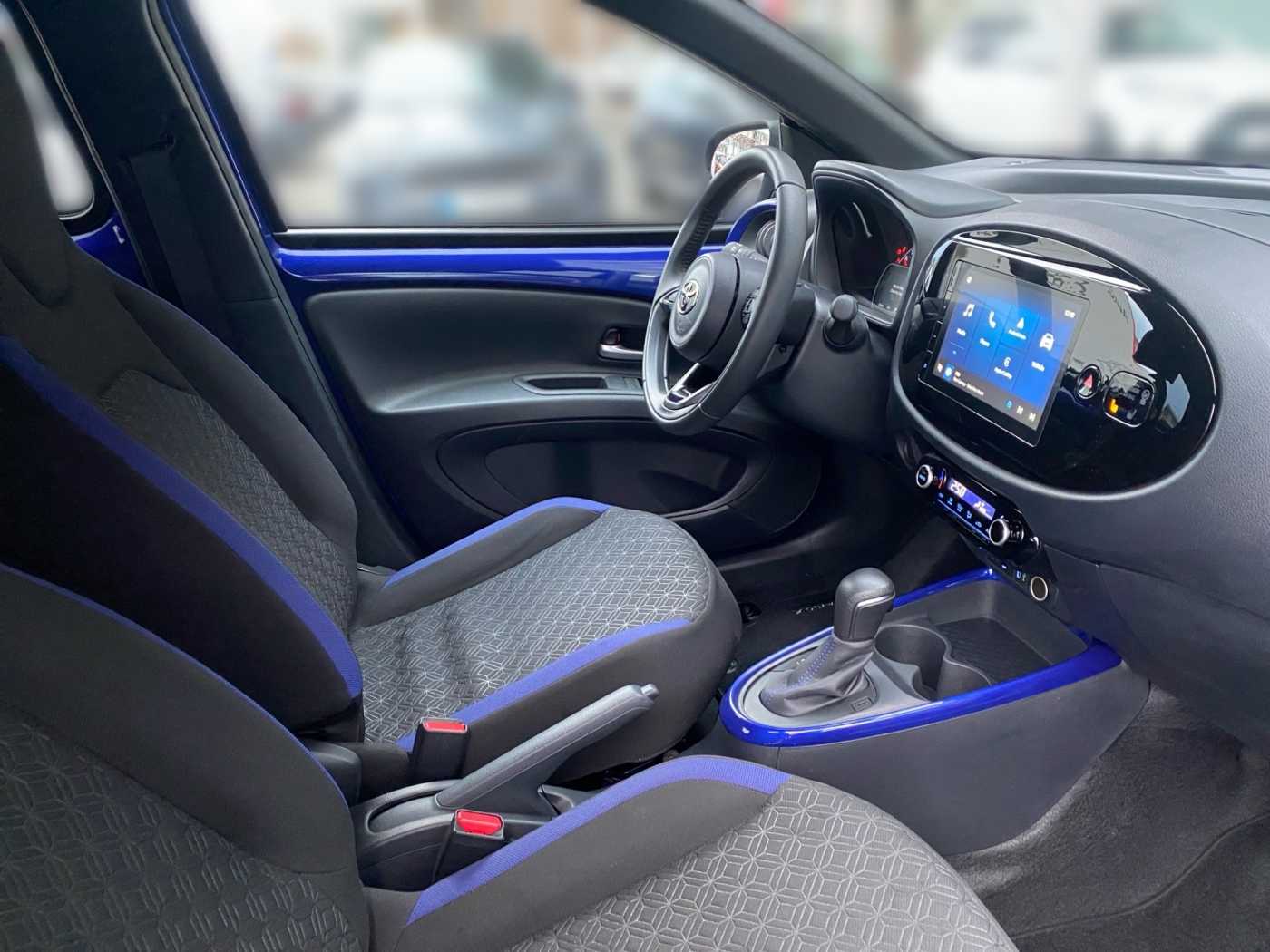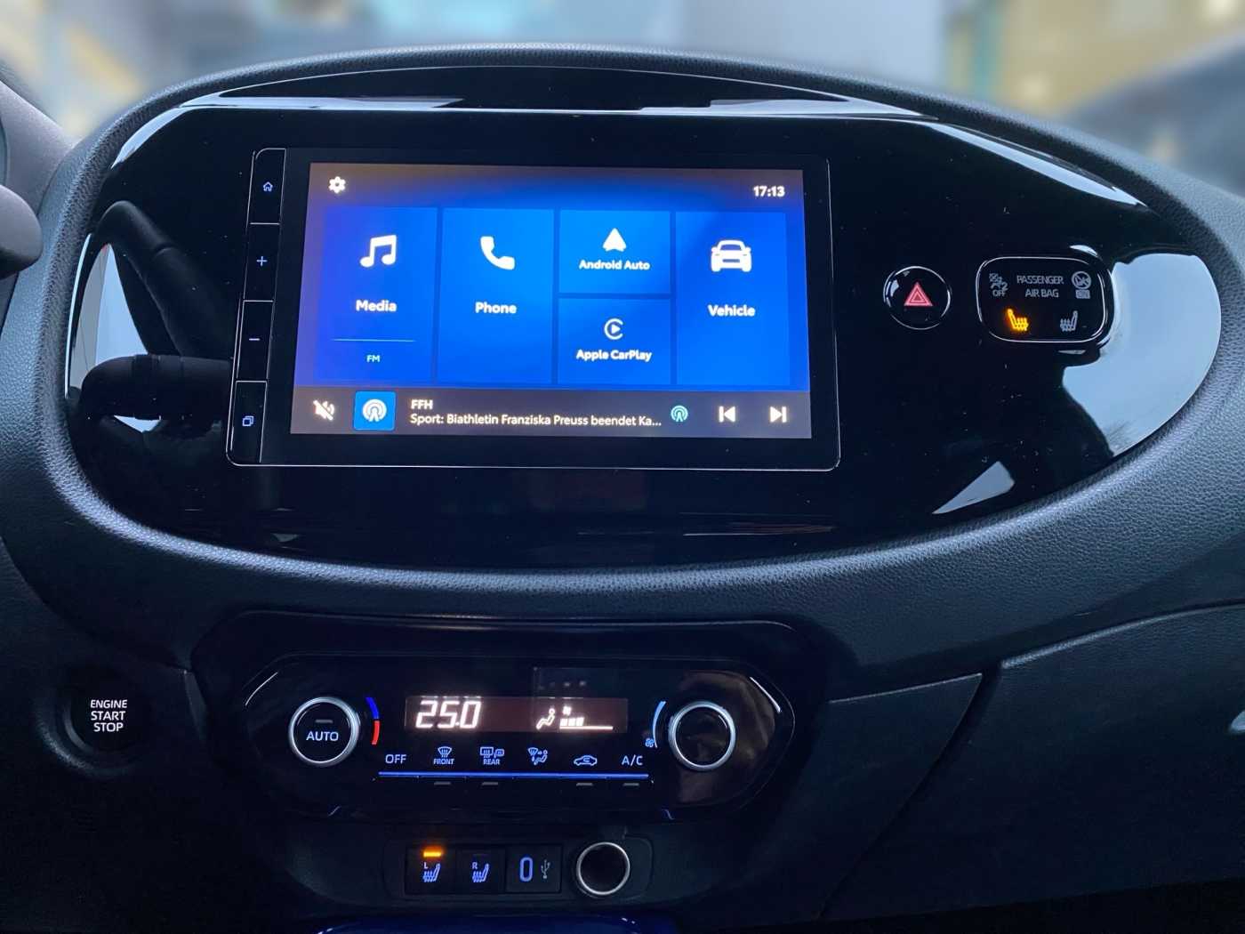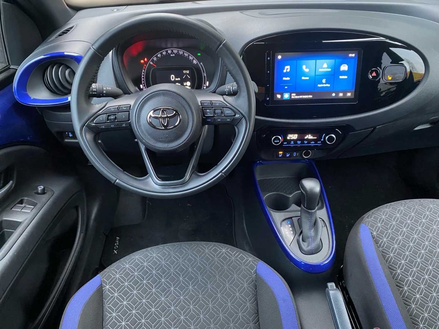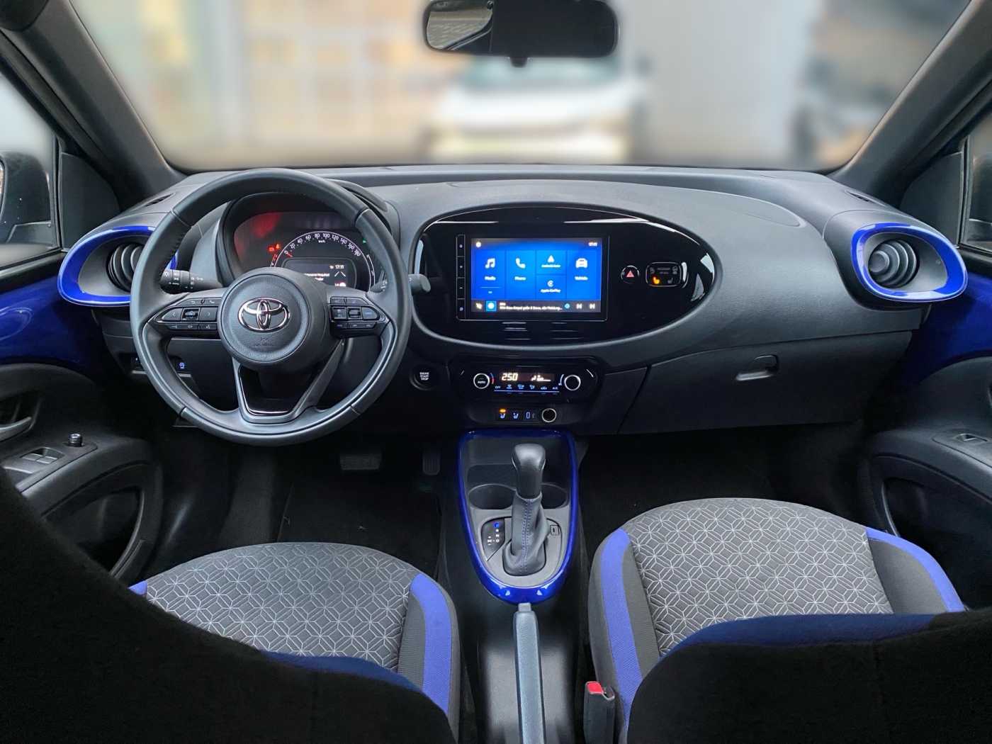 Interne Nummer: 00219985, Fahrzeugstandort: Wächtersbach * Scheibenwischer mit Regensensor * Klimaanlage * Zentralverriegelung * Zentralverriegelung * Dach in Kontrastfarbe * Mica-Lackierung * 3. Bremsleuchte * Airbag Fahrer-/Beifahrerseite * Anti-Blockier-System (ABS) * Audiobedienung am Lenkrad * DAB-Tuner (Radioempfang digital) * Multimedia Display (9,0 Zoll) * Freisprechanlage Bluetooth * Bluetooth-Schnittstelle * USB-Schnittstelle * Smartphone-Integration x-connect (Apple CarPlay und Android Auto) * Außenspiegel elektr. verstell- und heizbar * Außenspiegel schwarz lackiert * Nebelscheinwerfer * Verglasung hinten abgedunkelt * Elektron. Stabilitäts-Programm mit Antriebs-Schlupfregelung (VSC mit TRC) * Fahrassistenz-System: Eco-Anzeige für verbrauchsoptimiertes Fahren * Fahrassistenz-System: Fernlichtassistent (Abblendautomatik Fahrlicht, AHB) * Fahrassistenz-System: Sicherheitssystem Toyota Connect mit automatischem Notruf (eCall) * Fensterheber elektrisch vorn * Gepäckraumabdeckung / Rollo * Geschwindigkeits-Begrenzeranlage * Geschwindigkeits-Regelanlage (Tempomat) mit Abstandsregelung * Getriebe Automatik stufenlos – CVT * Innenraumfilter: Staub- und Pollenfilter mit Aktivkohlefilter * Isofix-Kindersitz-System * Karosserie: 5-türig * Kindersicherung * Kopf-Airbag-System * Kopfstützen hinten * Lenkrad (3-Speichen) * Lenkrad (Leder) * Lenkrad Applikationen in Pianoschwarz * Lenksäule (Lenkrad) höhenverstellbar * LM-Felgen * Motor 1,0 Ltr. – 53 kW KAT * Park-Assistent mit Rückfahrkamera * Reifen-Reparaturkit * Reifendruck-Kontrollsystem * Rücksitz geteilt * Schadstoffarm nach Abgasnorm Euro 6d * Schutzfolie Türgriffmulde * Seitenairbag vorn * Servolenkung elektrisch * Sitz vorn links höhenverstellbar * Sitzheizung vorn * Sonnenblende rechts mit Make-up-Spiegel * Stop&Go-System (TSGS) * Stoßfänger Wagenfarbe * Tagfahrlicht LED * Fahrassistenz-System: Verkehrszeichenerkennung (RSA) * Fahrassistenz-System: Pre-Collision-System (PCS) * Fahrassistenz-System: Spurhalteassistent (LDA) * Fahrassistenz-System: Müdigkeitserkennungs-Sensor * Türgriffe außen Wagenfarbe * Türgriffe innen verchromt * Warnanlage für Sicherheitsgurte hinten * Warnanlage für Sicherheitsgurte vorn * Zentralverriegelung