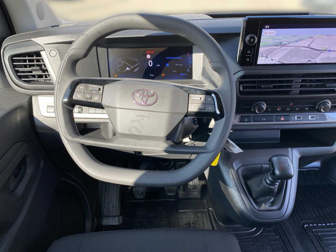 -Außenspiegel, elektrisch einklappbar -Außenspiegel, Toter-Winkel-Warner -Navigationssystem Toyota ProTouch&Go -Nebelscheinwerfer LED -Flankenschutz -Einparksensoren, vorne -Nebelscheinwerfer, Umrandung silbern -16'' Stahlfelgen -4 Lautsprecher -USB C Anschluss -10 Multimedia Display -Audiobedienelemente im Lenkrad integriert -Multimedia-Audiosystem -Geschwindigkeitsregelanlage -Fahrer- und Beifahrerairbag -Geschwindigkeitsbegrenzer, Verkehrsschilderkennung (RSA) -Spurhalteassistent -Einparksensoren, hinten -Reifendruck-Warnsystem (TPWS) -Notrufsystem -Airbag, Beifahrer/Fahrer vorn -Berganfahrhilfe (HAC) -Stoßfänger hinten, schwarz -Heckflügeltüren, verblecht -Stoßfänger vorne, schwarz -Türgriffe, schwarz außen -Außenspiegel, beheizbar -Außenspiegel, elektrisch einstellbar -Türen Seitenschutz, schwarz -Außenspiegel, schwarz -Schiebetür Beifahrerseite -Heckflügeltüren, Öffnungswinkel 180° -Ablagefächer, Türen vorne -Farb-Multi-Info-Display -Beifahrerdoppelsitzbank -12V Anschluss vorne -Getränkehalter, vorne -Klimaanlage, manuell -Laderaum, Trennwand geschlossen -Toyota Smart Cargo mit Durchladesystem, hochklappbarem Beifahrersitz und MobileOffice-Funktion -Zentralverriegelung, schlüsselintegrierte Funkfernbedienung/Blinkerbestätigung -12V Anschluss, Laderaum -Sitz Fahrer, Rückenlehne manuell -Zentralverriegelung -Sitz Fahrer, Lordosenstütze -Handschuhfach, offen/oben -Deckenbeleuchtung (2), Laderaum -Leselampe, vorne -10 Multi-Info-Display -Sitz Fahrer, Längsverstellung manuell -Armlehne Fahrer -Regensensor -Halogenscheinwerfer -Fensterheber, elektrisch ( One-Touch ) -Geräuschdämmungs-Schicht vordere Türscheiben -Privacy Glas -Fensterheber, elektrisch vorne -Fernlicht Assistent (AHB),
