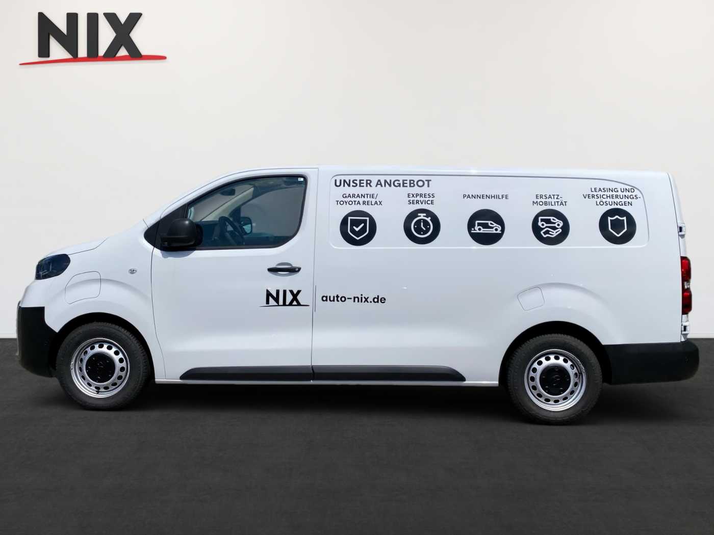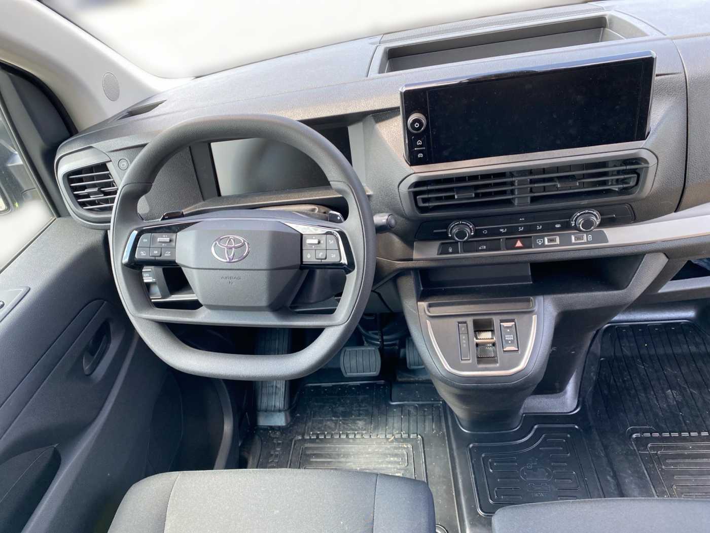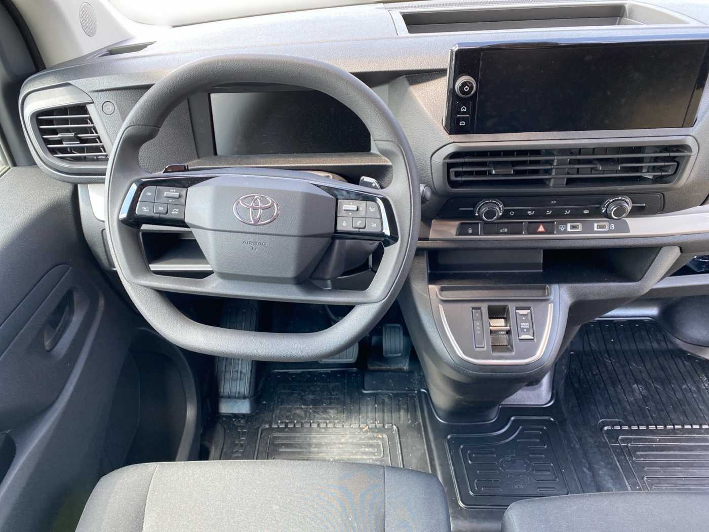-Außenspiegel, elektrisch einklappbar -Außenspiegel, Toter-Winkel-Warner -Navigationssystem Toyota ProTouch&Go -Nebelscheinwerfer LED -Flankenschutz -Einparksensoren, vorne -Nebelscheinwerfer, Umrandung silbern -4 Lautsprecher -USB C Anschluss -10 Multimedia Display –Audiobedienelemente im Lenkrad integriert -Multimedia-Audiosystem -Geschwindigkeitsregelanlage -Fahrer- und Beifahrerairbag -Geschwindigkeitsbegrenzer, Verkehrsschilderkennung (RSA) -Spurhalteassistent -Einparksensoren, hinten -Reifendruck-Warnsystem (TPWS) -Notrufsystem -Airbag, Beifahrer/Fahrer vorn -Berganfahrhilfe (HAC) -Rückfahrkamera -Stoßfänger hinten, schwarz -Heckflügeltüren, verblecht -Stoßfänger vorne, schwarz -Türgriffe, schwarz außen -Außenspiegel, beheizbar -Außenspiegel, elektrisch einstellbar -Türen Seitenschutz, schwarz -Außenspiegel, schwarz -Schiebetür Beifahrerseite -Heckflügeltüren, Öffnungswinkel 180° -On-Board-Charger (11 kWh) -Feststellbremse, elektrisch -Ablagefächer, Türen vorne -Farb-Multi-Info-Display -Beifahrerdoppelsitzbank -12V Anschluss vorne -Getränkehalter, vorne -Klimaanlage, manuell -Laderaum, Trennwand geschlossen -Toyota Smart Cargo mit Durchladesystem, hochklappbarem Beifahrersitz und MobileOffice-Funktion -Zentralverriegelung, schlüsselintegrierte Funkfernbedienung/Blinkerbestätigung -Start-/Stop-Automatik -12V Anschluss, Laderaum -Sitz Fahrer, Rückenlehne manuell -Zentralverriegelung -Sitz Fahrer, Lordosenstütze -Handschuhfach, offen/oben -Deckenbeleuchtung (2), Laderaum -Leselampe, vorne -10 Multi-Info-Display -Sitz Fahrer, Längsverstellung manuell -Innenraumbeleuchtung, vorne -Lenkrad, Urethan -Armlehne Fahrer -Regensensor -Halogenscheinwerfer -Fensterheber, elektrisch ( One-Touch ) -Geräuschdämmungs-Schicht vordere Türscheiben -Privacy Glas -Fensterheber, elektrisch vorne -Abblendlichtautomatik -Fernlicht Assistent (AHB)