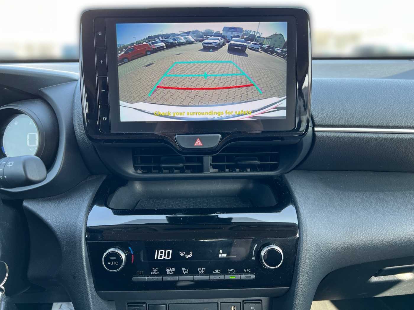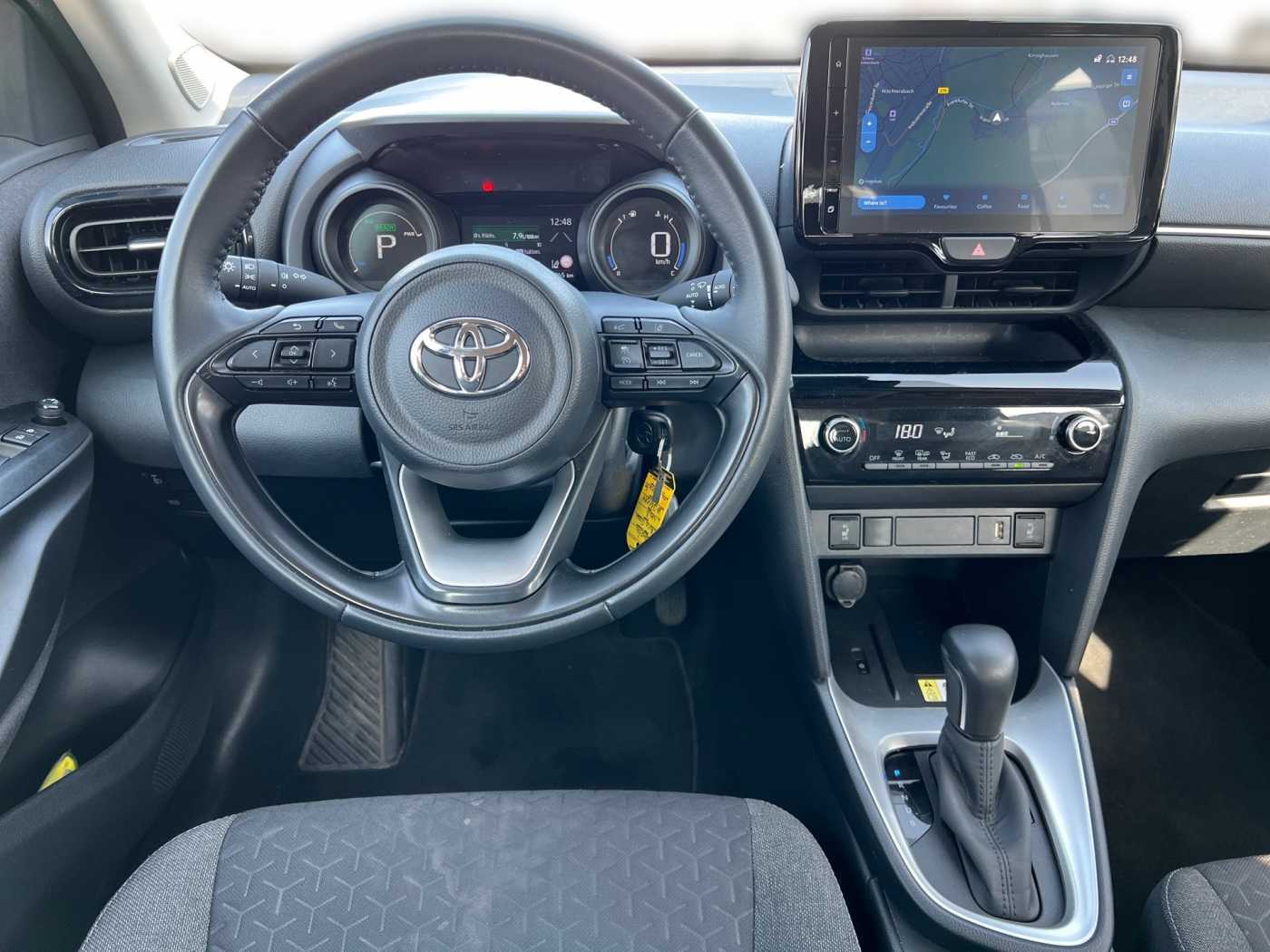 Toyota Safety Sense: Pre-Collision-System (PCS) – Front-Kollisionswarner (FCW) – Notbrems -Assistent mit autonomer Notbremsfunktion (AEB) mit Fußgängererkennung (Tag und Nacht) und Radfahrererkennung (Tag) – Kreuzungs-Assistent (Fußgänger- und Fahrzeugerkennung beim Überqueren einer Kreuzung) – Spurhalte-Assistent, mit aktiver Lenkunterstützung (LDA) – Spurverfolgungs-Assistent (LTA) – Verkehrszeichenerkennung (RSA) – Geschwindigkeitsregelanlage, adaptiv/intelligent (iACC), Airbag Fahrer-/Beifahrerseite, Aktive Kopfstützen vorn, Anti-Blockier-System (ABS), Antriebsart: Frontantrieb, Audiobedienung am Lenkrad, DAB-Tuner (Radioempfang digital), Multimedia Display (9,0 Zoll), 6 Lautsprecher, Freisprechanlage Bluetooth, Bluetooth-Schnittstelle, USB-Schnittstelle, Smartphone-Integration x-connect (Apple CarPlay und Android Auto), Cloud-Navigationssystem, Autom. Begleitfunktion der Beleuchtung (Follow me home, FMH), Außenspiegel elektr. verstell- und heizbar, Bremsassistent, Dachantenne, Elektr. Bremskraftverteilung, Elektron. Stabilitäts-Programm mit Antriebs-Schlupfregelung (VSC mit TRC), Fahrassistenz-System: Berganfahrkontrolle (HAC), Fahrassistenz-System: Eco-Anzeige für verbrauchsoptimiertes Fahren, Fensterheber elektrisch vorn + hinten, Fernbedienung für Zentralverriegelung, Geschwindigkeits-Begrenzeranlage, Geschwindigkeits-Regelanlage (Tempomat) mit Abstandsregelung, Getriebe Automatik stufenlos – Multidrive ECVT, Heckleuchten LED, Heckspoiler, Hybrid 85 kW (Motor 1,5 Ltr. – 68 kW), Innenraumfilter: Staub- und Pollenfilter mit Aktivkohlefilter, Isofix-Kindersitz-System, Karosserie: 5-türig, Kindersicherung elektr. betätigt, Klimaautomatik, Kopf-Airbag-System, Kopfstützen hinten, Lenkrad (Leder), Lenksäule (Lenkrad) verstellbar, Rückfahrkamera, Parkbremse elektrisch (EPB), Radstand 2560 mm, Reifen-Reparaturkit, Reifendruck-Kontrollsystem, Rücksitz klappbar, Schadstoffarm nach Abgasnorm Euro 6d, Schalt-/Wählhebelgriff Leder, Scheibenwischer mit Regensensor, Scheinwerfer H7, Seitenairbag vorn, Service-System: MyT-Connected Services, Servolenkung elektrisch, Sitz vorn links höhenverstellbar, Sitz vorn rechts höhenverstellbar, Sitzbezug / Polsterung: Stoff, Sitzheizung vorn, Steckdose (12V-Anschluß) in Mittelkonsole, Stoßfänger Wagenfarbe, Tagfahrlicht LED, Türgriffe außen Wagenfarbe, Uni-Lackierung, Warnanlage für Sicherheitsgurte hinten, Warnanlage für Sicherheitsgurte vorn, Zentralverriegelung mit Fernbedienung, We speak english, Nous parlons aussi français, Die Fahrzeugbeschreibung dient lediglich der allgemeinen Identifizierung des Fahrzeuges und stellt keine Gewährleistung im kaufrechtlichen Sinne dar. Die Angaben erheben nicht den Anspruch auf Vollständigkeit und sind ohne Gewähr. Zwischenverkauf, Irrtum und Änderungen vorbehalten!