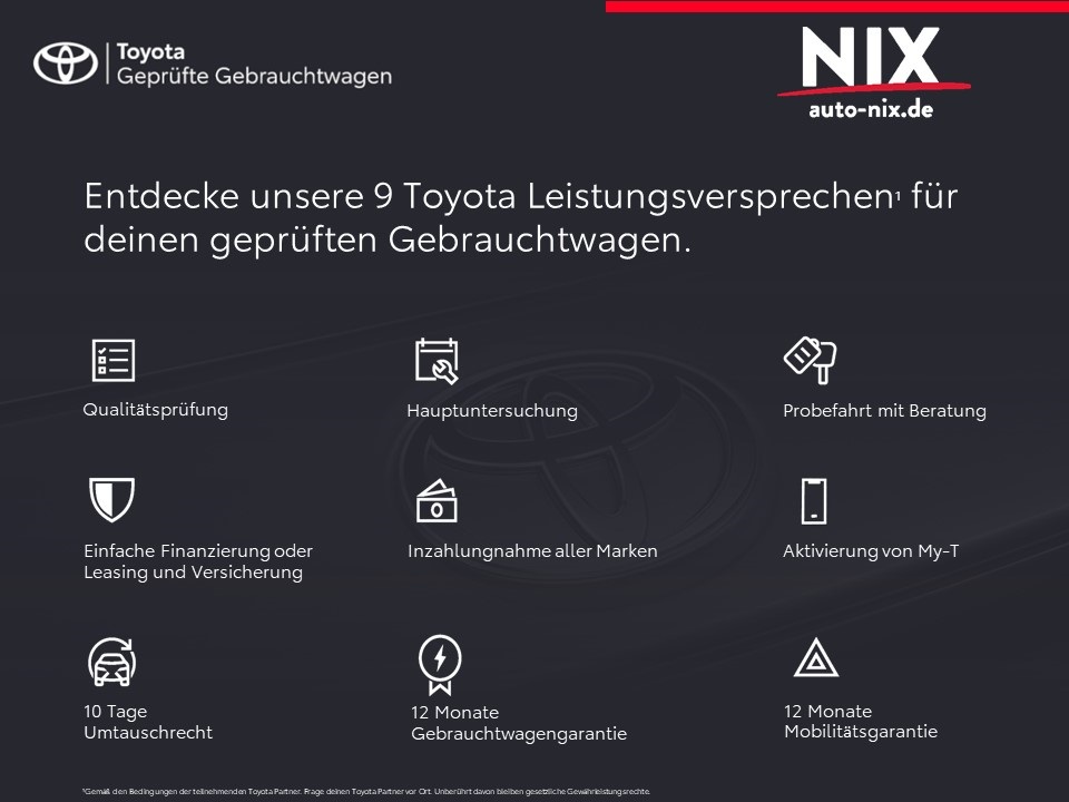 Ein Finanzierungsprogramm der Toyota Kreditbank Toyota-Allee 5, 50858 Köln. Das dargestellte Finanzierungsangebot beruht auf einer Fahrzeuglaufleistung von 10.000 km pro Jahr. Ein Finanzierungsprogramm der Toyota Kreditbank Toyota-Allee 5, 50858 Köln. Das Angebot stellt das repräsentative Beispiel nach § 6a Preisangabenverordnung dar. Ist der Darlehensnehmer Verbraucher, besteht ein Widerrufsrecht nach § 495 BGB. 2. Gilt nur für Privatkunden.